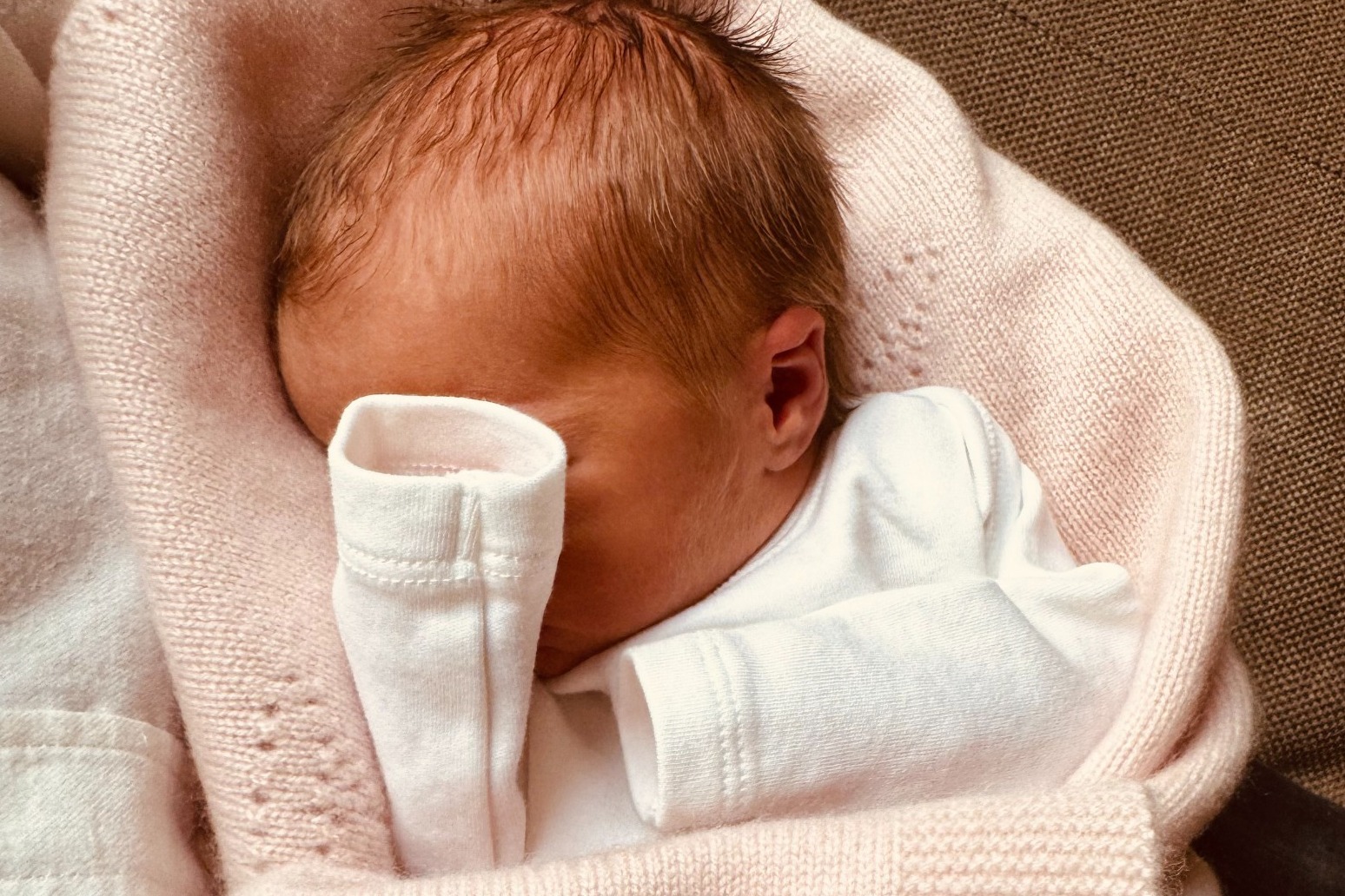 Beatrice and Mr Mapelli Mozzi released a photograph of their daughter taken by Mr Mapelli Mozzi, showing Athena with dark hair, wearing a white long-sleeved garment, and wrapped in a pink blanket with her face hidden by her arm.