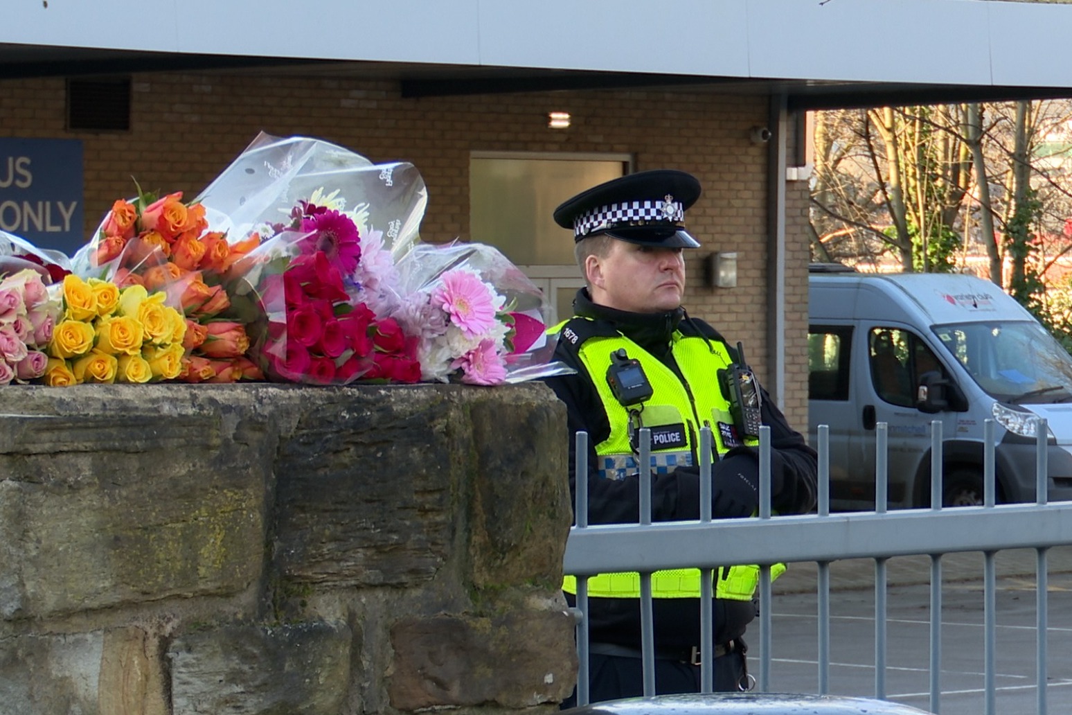 Flowers, candles and balloons have been left on a wall outside the school.