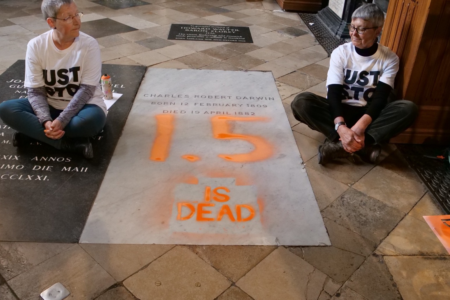 Just Stop Oil (JSO) supporters have spray-painted “1.5 is dead” on Charles Darwin’s grave following confirmation that last year was the first to breach the key global warming threshold.
